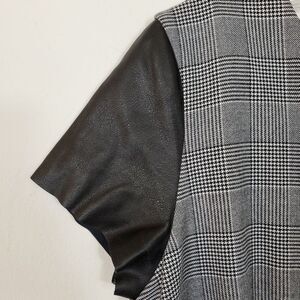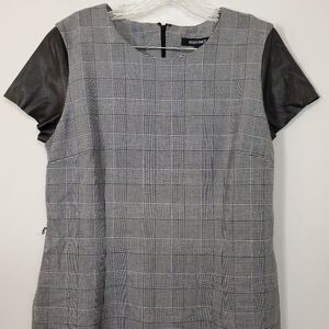 Chic and versatile sheath dress from Ellen Tracy in a classic black & gray glen plaid check with modern faux leather short sleeves. Features a tailored sheath silhouette, knee-length cut, and back zip closure — perfect for business casual wear, office meetings, or a polished evening look.