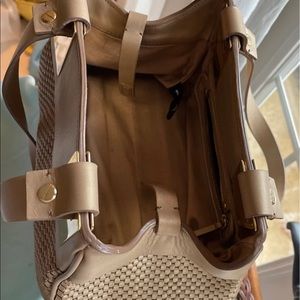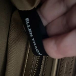 Matte Gold Leather Ellen Tracy open top handbag with gold tone hardware. Woven Leather with leather magnetic connector for closure. Slip pocket on one side with 3 slip pockets on the other. Fun beautiful bag!!
