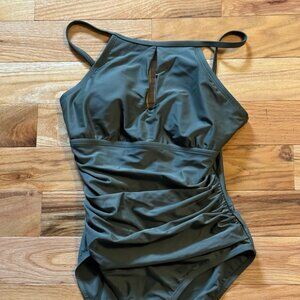 Ellen Tracy High Neck Keyhole One Piece SwimSuit Size 8 Green