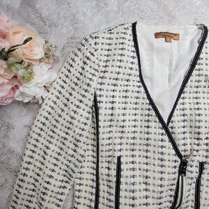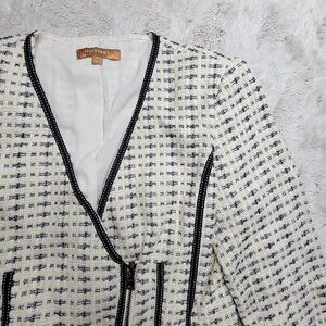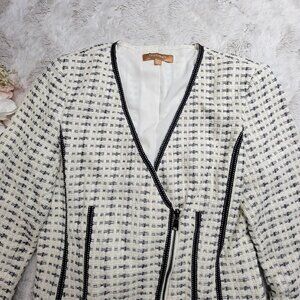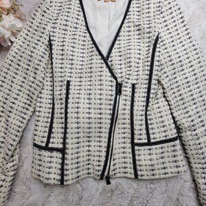 Ellen Tracy Ivory Black Diagonal Zip V Neck Knit Blazer Size 8.