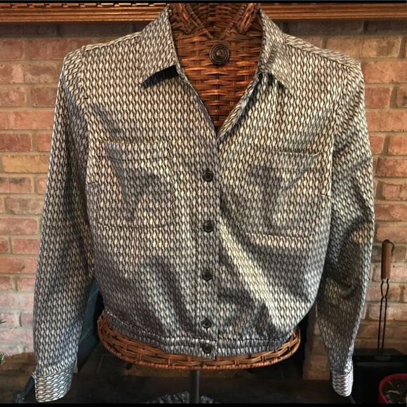 Lovely Ellen Tracy jacket with elastic at waist. It is 54% cotton, 44% polyester, and 2% spandex. It is a size medium. I would say this is a black and either silver or grey color combination. It is not an ivory.