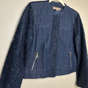 This Ellen Tracy jean jacket is a stylish piece for women in size small. Made of dark wash denim with floral lace trim on sleeves, zipper cover and back along neckline