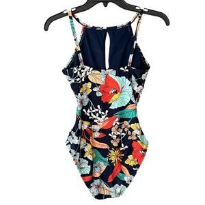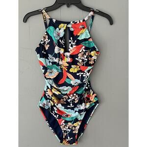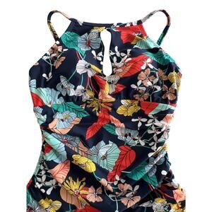Ellen Tracy Keyhole High Neck One Piece Swimsuit Tropical Floral Size 6 Ruching
