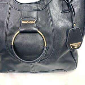 A spacious tote style shoulder bag in black vegan leather with gold hardware by Ellen Tracy. A decorative ring and hanging tag add visual interest in front. Dual handles have an 11" drop. The bag is secured with a magnetic snap which opens to three compartments, the middle one zippered, and one internal zip pocket, a cell phone pocket with snap and loop and a slip pocket. The bag is lined in signature black poly fabric. Very good preowned condition, clean inside and out. There are a couple of nicks in the vegan leather exterior as shown. Please see photos for more details.