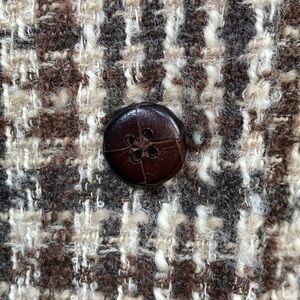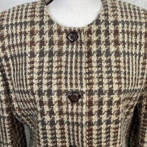 Ellen Tracy Linda Allard Woman Wool/Alpaca Blend Brown/Gray/Cream Blazer Size 10. Beautiful tweed, houndstooth, slightly fuzzy fabric with large leather look buttons that close up the front. Has faux pockets and shoulder pads and is fully lined. Good pre owned condition.
