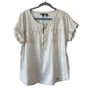 Ellen Tracy Linen Blend 3/4 Roll Tab Sleeve Gold Accent Tunic Top Sz L