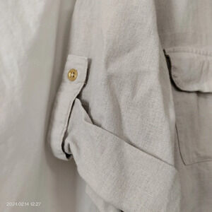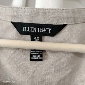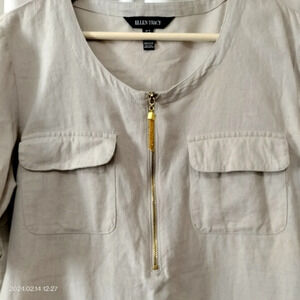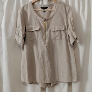 Ellen Tracy Linen Tunic Size Medium Khaki Rolled Sleeves Gold Tone accents