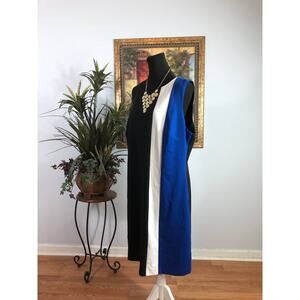 Ellen Tracy sleeveless sheath dress featuring a striking black, white, and blue colorblock design. Ideal for the office or semi-formal occasions, the flattering silhouette is crafted from a structured stretch-blend fabric. A perfect blend of modern style and comfort.
