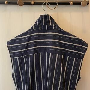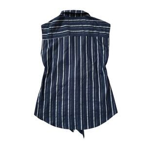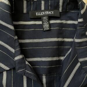 This Ellen Tracy sleeveless button-down top in Size M adds an elevated twist to a classic piece. With vertical navy and metallic gold pinstripes and a flattering front tie detail, this blouse is ideal for layering under blazers, pairing with trousers, or styling casually with denim. Lightweight and elegant, it drapes beautifully for a polished, feminine silhouette.