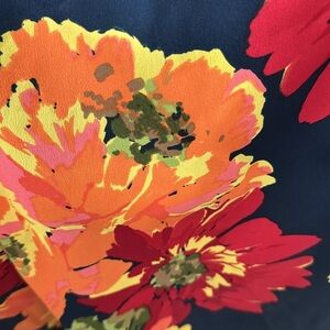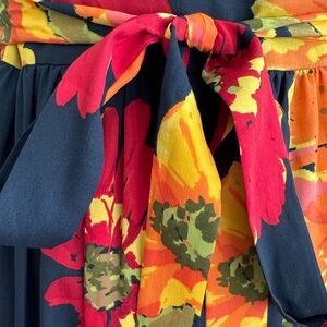 Ellen Tracy Multi Floral Red Yellow Orange Navy Sleeveless Maxi Dress Size 6 in very nice used condition. This dress is just stunning. It is a navy dress with bold vibrant colors of red, orange, yellow and green in an all over floral print. The dress has a V-neckline and a cinched waist, creating a flattering silhouette with a criss cross in the back. It is lightweight and has pullover styling with a hidden side zipper. Measures approximately 17” inches underarm to underarm and from shoulder to hem approximately 56” inches! Perfect for next tropical vacation or destination wedding 🌺