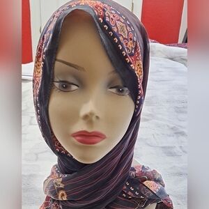 pre owned, browns, reds & black make up the 4 different designs on this scarf, has a solid black border