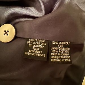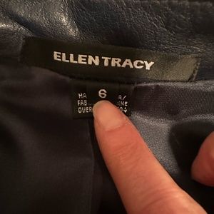 VIntage Ellen Tracy navy blue leather jacket - gently used. Has a small scratch on lower right hand front. I have documented in picture above.
