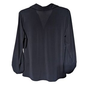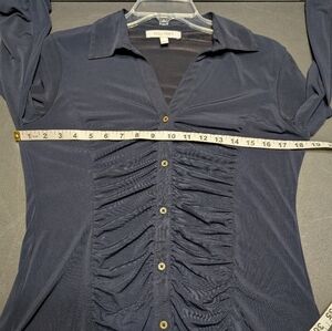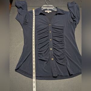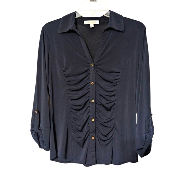 Ellen Tracy Navy Blue V-neckline Gathered Button Front 3/4 Sleeve Blouse Size S