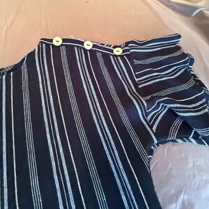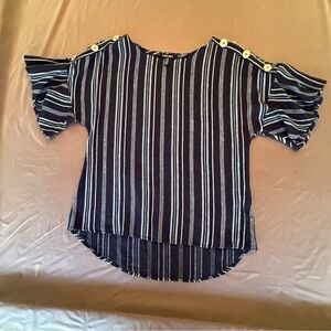 Stylish navy and white striped blouse. Features button detail on shoulders. Perfect for casual wear.