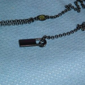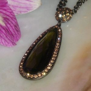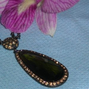 Ellen Tracy Necklace and Earring Set, Olive tear shaped pendant. EllenTracy Necklace and Earring set ( Matching earrings not shown) Olive Tear shaped pendant surrounded by chocolate color rhinestones. Very pretty set, classy and it will match almost any color outfit. Signed Ellen Tracy next to clasp. Meant to be worn chocker style, it only measures 10 inches including pendant. Nice, nice set! Really nice accessory item. Please look in my store since I am always finding new items.