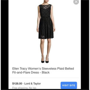Another great party dress. This sleeveless belted fit and flare dress is new without tags (never worn). It’s black with black and gold plaid detail. Belt is a thin black patent leather. A wonderful little black dress that belongs in every closet