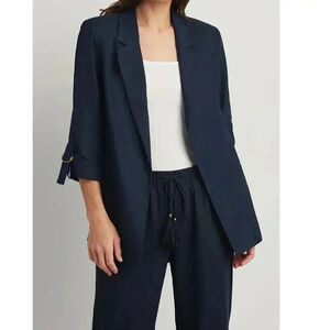 Ellen Tracy Open Front Linen Blend Blazer Size Medium Navy Blue Gold Ring