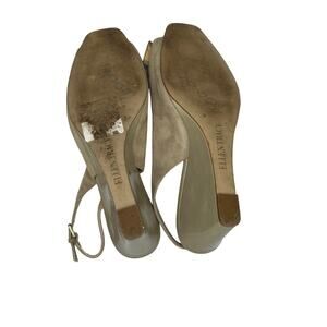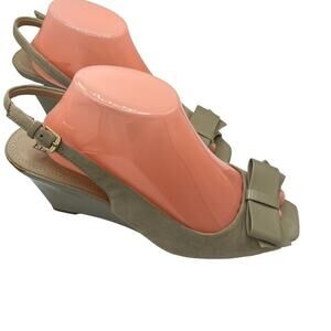 These Ellen Tracy, adjustable slingback, open toe, wedge heel shoes are a neutral taupe or tan color that will pair well with many wardrobe choices. 3 inch wedge, suede uppers with patent leather bow on the toes. Genuine leather upper. This is a perfect shoe for career wear, summer occasions, parties, vacation, summer or spring.
