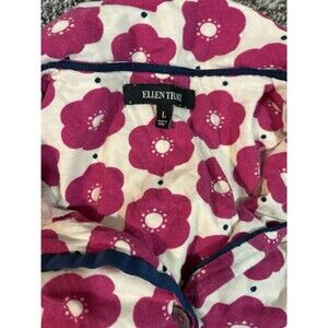 The Ellen Tracy Pajama Set is a stylish and comfortable choice for women in size large. The long sleeve button top features a pretty floral pattern in pink, blue, and white, with a collared neckline and piping accents. Made from a blend of cotton and rayon, this lightweight knit set is perfect for all seasons and offers a classic loungewear style that is both relaxing and fashionable. Ideal for lounging at home, this pajama set combines comfort with a touch of feminine charm, making it a versatile addition to any woman's sleepwear collection.