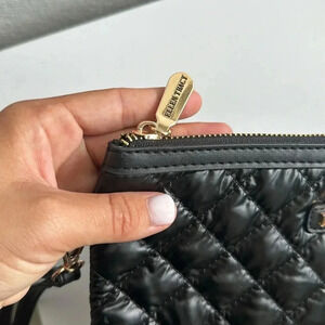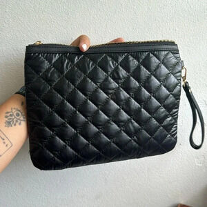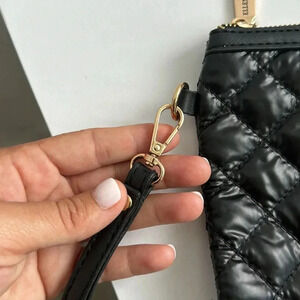 Features a quilted nylon exterior, detachable wrist strap, and gold-tone hardware.