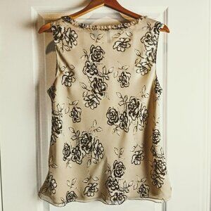 Fully-lined sleeveless silk top with raw edge trim from Ellen Tracy in neutral cream, tan and brown floral print.