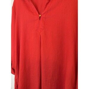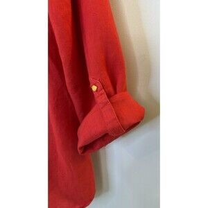 Chic and classic Ellen Tracy womens tunic top in vibrant red. Made from 100% linen, this lightweight and breathable blouse is perfect for warm weather, vacations, or layering year-round. Features a collared split neckline, relaxed fit, and long sleeves with roll-tab cuffs secured by gold-tone button detail.