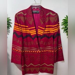 Vibrant geometric patterns. Rich red and orange tones. Ideal for bold fashion statements.