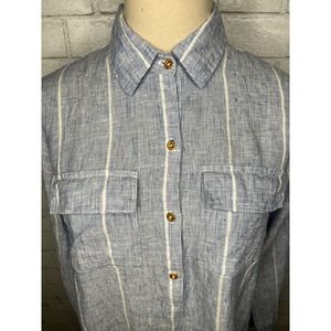 Ellen Tracy S Long Sleeve 100% LINEN Button Up Shirt Blouse Blue White