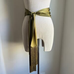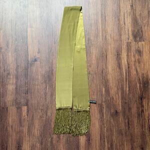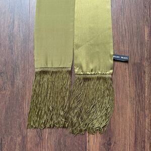 Details: Brand: Ellen Tracy. Fabric: Silk (shiny/matte texture). Color: Olive green. Dimensions: Approx. 73" x 5". Fringe tassel ends.