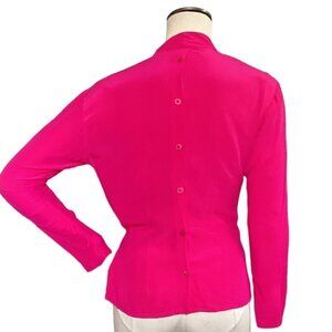 The Ellen Tracy Silk Button Back Surplice Faux Wrap Blouse in size 6 is a stylish and elegant top perfect for a party or business occasion. Made of lightweight silk material, this blouse features a V-neckline, long sleeves, and a button closure. The pink color and solid pattern add a touch of colorfulness and Barbiecore style to your outfit, making it a versatile piece for any season. With features like shoulder pads and breathability, this blouse offers both comfort and sophistication, making it a great addition to your wardrobe.