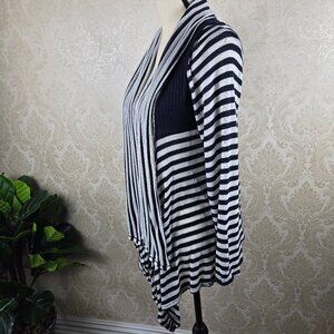 Navy blue and white striped cardigan has a waterfall front with a straight hem in the back. No front closure. No pockets. Long sleeves.