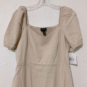 Tags: cream puff sleeve dress, linen midi dress, cottagecore dress, romantic summer dress, smocked back dress, square neck dress, neutral midi dress, minimalist dress, feminine ruffle dress, boho midi dress, casual wedding guest dress