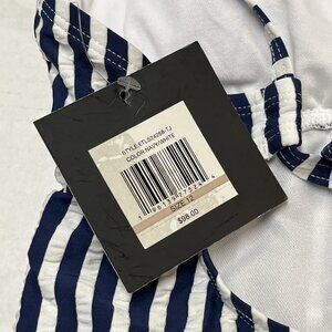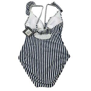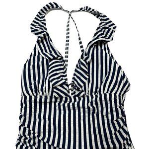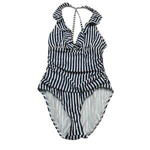 Ellen Tracy Swimsuit Womens 12 Navy Stripe Ruffle Top Ruched One Piece Nautical