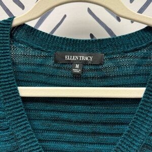 This is a beautiful teal and black knit v-neck sweater from Ellen Tracy. It has a slight hi-low cut with slits on the sides. Long sleeved. Size Medium!