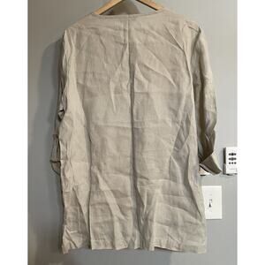 This Ellen Tracy top is a boho-inspired tunic made of linen, featuring a lace-up neckline for added detail. With a peasant style theme, this tunic is designed in a solid beige color and a woven fabric type. It is in size XL and suitable for various occasions such as travel, parties, casual outings, and business settings. This versatile piece can be worn in all seasons, making it a stylish and comfortable addition to any woman's wardrobe.