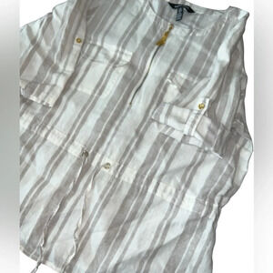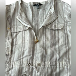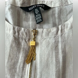 Ellen Tracy top. Taupe and off white striped. Roll up and leave down 3/4 sleeves. Cinch the waist…. Or not. Zip or unzip front to show a bit more skin.