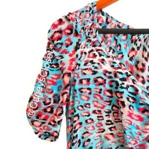 Ellen Tracy Top XS Silk Leopard Print Sheer Ruched Animal Pink Blue Bloomingdale