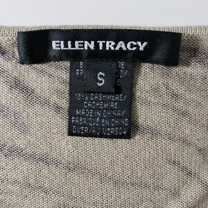 I purchased this many years ago at Saks Fifth Avenue, before the Ellen Tracy brand showed up in lower end department stores. Animal print knit blend of 87% bamboo viscose and 13% cashmere is very soft and hand washable. Colors are dark brown, tan, and medium brown. Crew neck, long sleeves, decorative ties at side. Very good pre-loved condition, no stains, snags, holes, or other damage. Size small, please check approx. measurements below taken flat before purchasing to determine if this sweater will fit you.