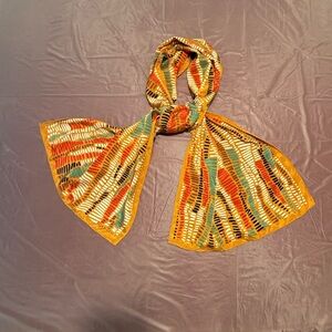 This Ellen Tracy scarf showcases a vibrant blend of orange and green in a retro-inspired design. Made from a soft, lightweight fabric, it drapes beautifully and adds a stylish touch to any outfit.