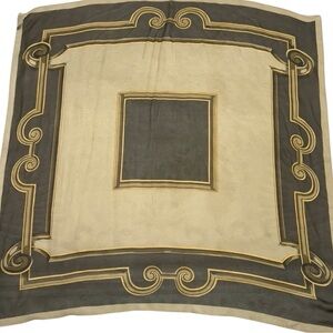 Elegant vintage Ellen Tracy silk scarf in a classic baroque-inspired scroll and border design. Neutral palette of gold, taupe, and brown makes this a versatile accessory for both work and casual wear. Oversized square shape perfect for styling as a wrap, headscarf, or accent piece. Minor spot noted (see photos), otherwise in great vintage condition.