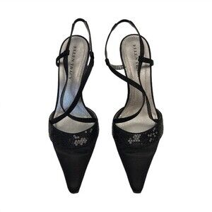 Ellen Tracy Weston Black Satin Sequence Pointed Toe Heels 8.5M. Black satin with black sequin detailing. Straps criss cross around the top of foot and heel. Pointed toe. Rubber on bottom soles to prevent slipping. Will ship without shoebox.