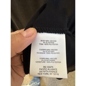 This Ellen Tracy Woman’s Loose Fit Shirt features a solid black design with 3/4 sleeves and a round neckline, perfect for casual occasions. The chiffon trimming on the bottom adds a delicate touch, along with strap accents on the back for a stylish look. The relaxed fit and casual sleeve make it suitable for summer, fall, and spring seasons, offering a comfortable and trendy option for women looking for a basic yet chic blouse.