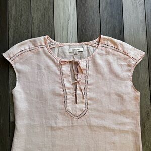 Chic blush blouse with tie-front detail. Cap sleeves and delicate stitching. Ideal for versatile styling.