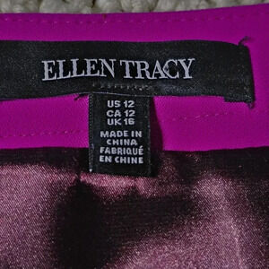 This Ellen Tracy skirt is a beautiful addition to any wardrobe. Made with 100% polyester, it has a soft and comfortable feel. The fuchsia color is bold and eye-catching, perfect for making a statement. This knee-length skirt is lined and features a regular fit, making it versatile for any occasion. It is a pre-owned item that has been well-maintained.