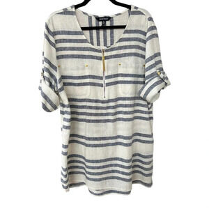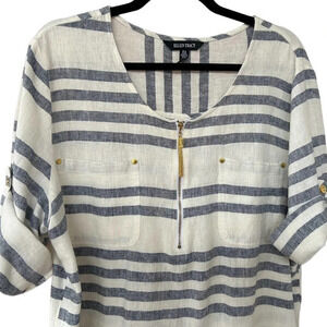 Ellen Tracy Women's Linen Striped Gold Accents Rollup Cuffed Sleeve Top Size XL