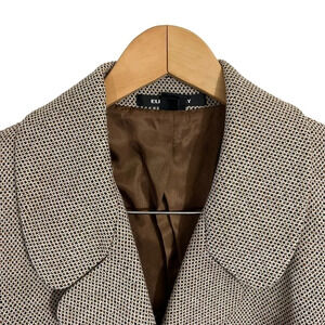 Womens size 12, jacket, blazer, beige, brown, neutral colors, collared, long sleeves, casual, business, office, workwear, career, professional formal, fall, winter, pull on, button closure, made in China, wool, spandex, acetate, dry clean