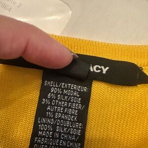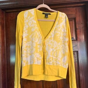 Chic yellow cardigan with white floral design. Ideal for layering. Adds elegance to any outfit.