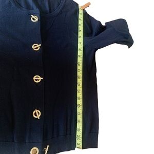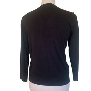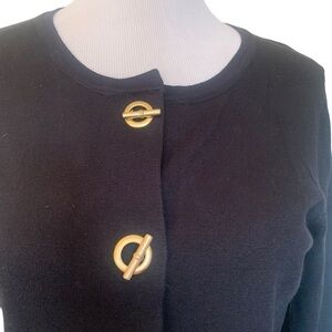 Black Ellen Tracy cardigan sweater with gold tone toggle closure. Three quarter length sleeve. Please see photos for design details measurements and ware.
