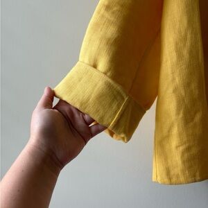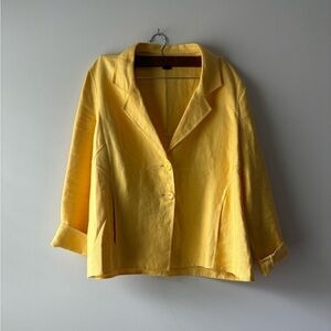 Ellen Tracy button blazer. No rips or bad odor. Does have small stains on the front (But does not show much). Bright yellow color. 100% Linen. Has two side pockets. Buttons up for closure. Loose fitted. Great to pair with white slacks. Please see pictures for more details.