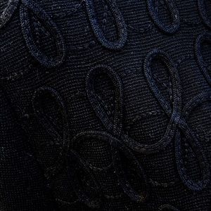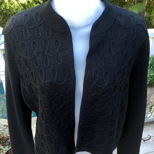 Elegant and chic short black knit jacket with appliqué embroidered design in front and cuffs. This is so beautiful with a skirt or dress plus works great with jeans and boots. Like new. 70% Silk. 30% Cotton